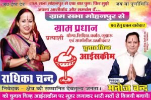 ग्राम सभा मोहनपुर से वर्तमान ग्राम प्रधान राधिका चंद ने एक बार फिर ग्राम प्रधानी के लिए नामांकन दाखिल कर चुनावी मैदान में अपनी दावेदारी पेश की है। उनका चुनाव चिन्ह “आइसक्रीम” निर्धारित किया गया है, जिससे वे गांव-गांव जाकर जनसम्पर्क कर रही हैं।