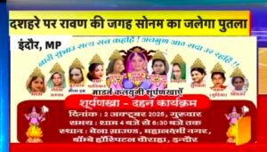 इस बार दशहरा महोत्सव में इंदौर के महालक्ष्मी नगर स्थित मेला ग्राउंड पर एक अनोखा दृश्य देखने को मिलेगा। परंपरागत रावण दहन की जगह समाज को झकझोर देने वाले राजा रघुवंशी हत्याकांड की आरोपी सोनम रघुवंशी का पुतला दहन किया जाएगा।